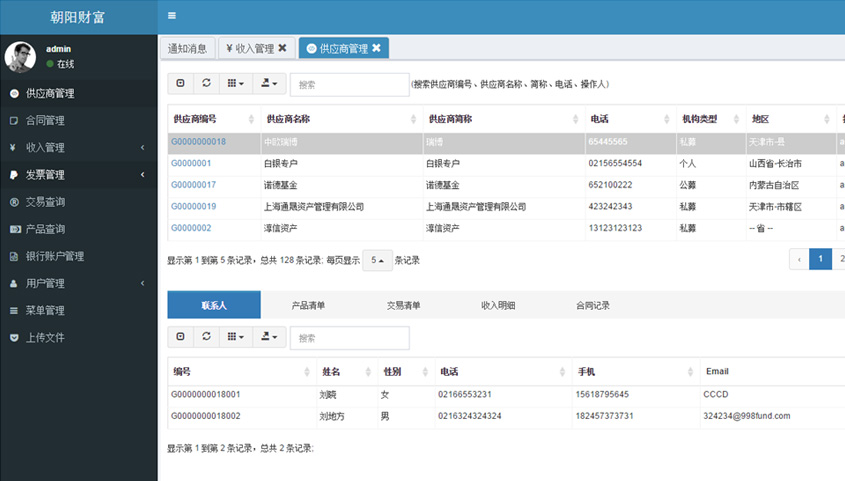 - 供應商管理: 供應商信息管理,包括交易、收入、聯(lián)系人、產(chǎn)品等